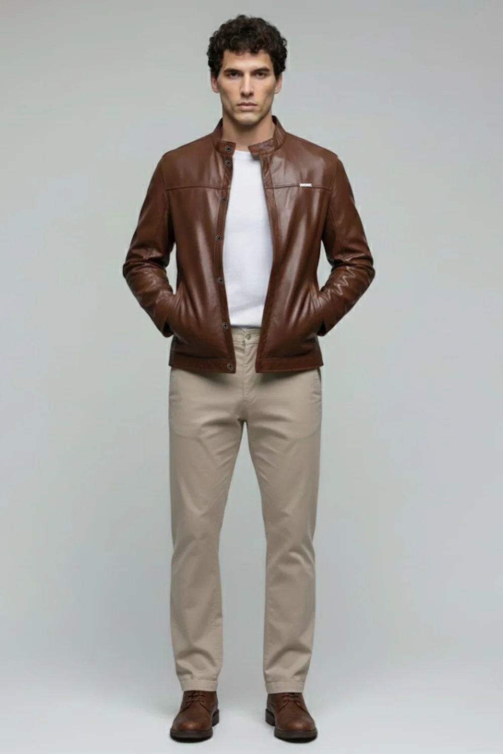 Step into the spotlight with the Tan Leather Jacket. Sleek faux leather, sharp structure, and an refined edge—subtle in shade, powerful in presence.
